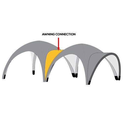 Both awning options feature dye-sublimated fabric graphics, matching the high-quality material used in the inflatable tent tops for a cohesive look. Installation is straightforward and quick—simply zip the awning in place, inflate the awning frame (for the standard option), and insert the support rods into the pole pockets beneath the awning.