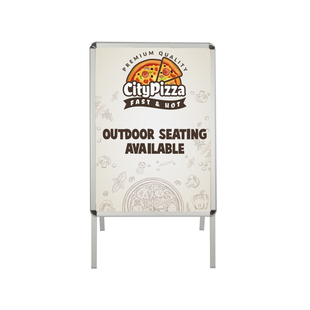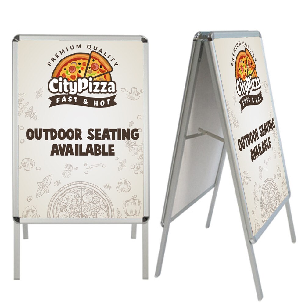 The 'A Frame' Aluminum Snap Frame is ideal for both indoor and outdoor use. It's easy-to-load snap frames come complete with glare reducing overlays to cover 23.25" x 33" signs. Good For Indoors and Outdoors. Comes With Two Plastic Cover Sheets.