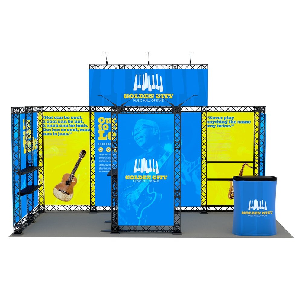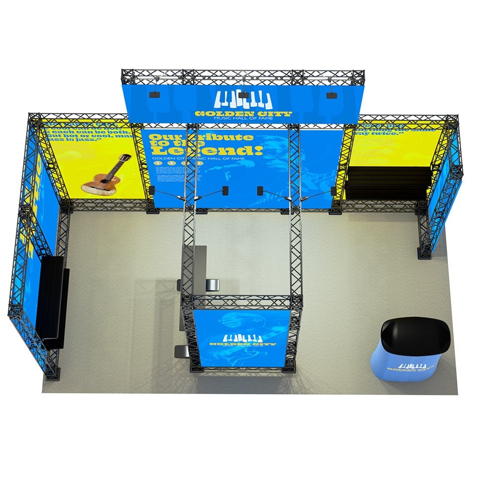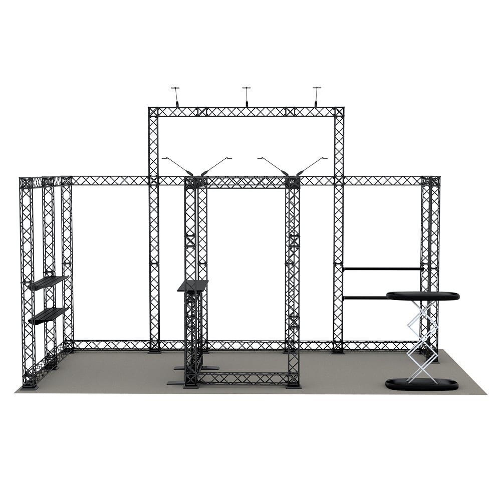 - Designed to fit in a 20ft x 10ft booth space. Please check your trade show guidelines to make sure this configuration conforms to the show regulations.