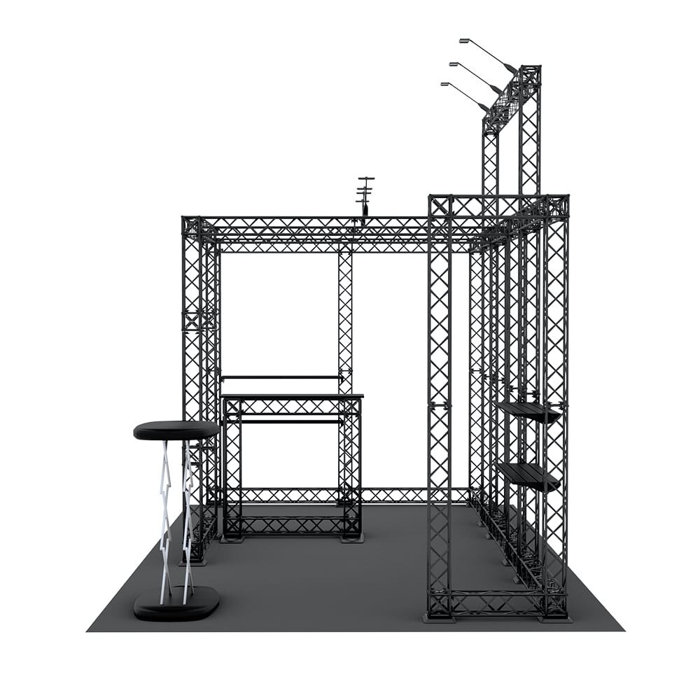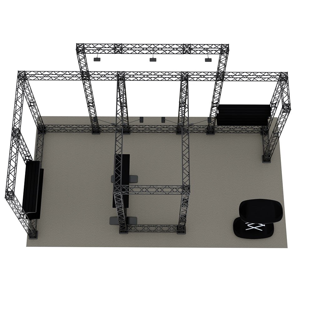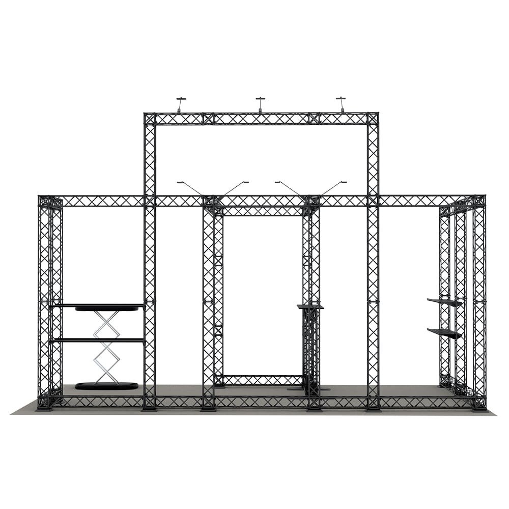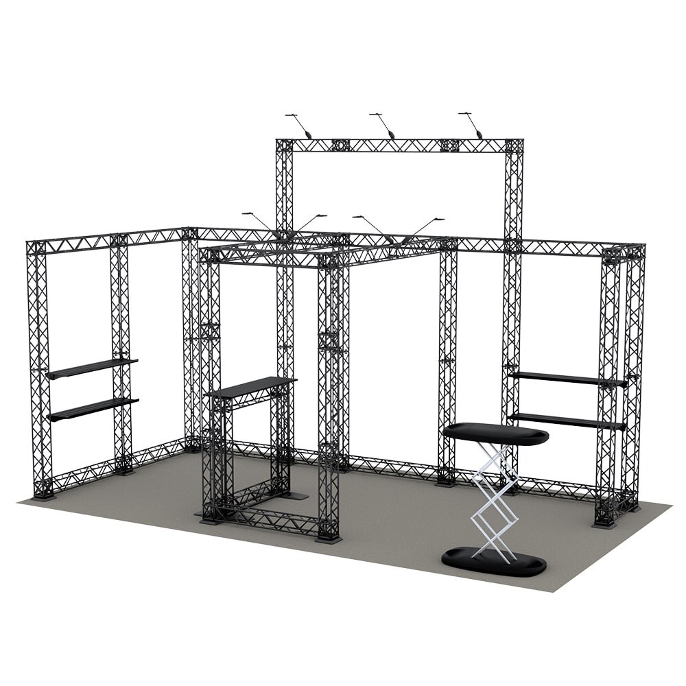 - Designed to fit in a 20ft x 10ft booth space. Please check your trade show guidelines to make sure this configuration conforms to the show regulations.