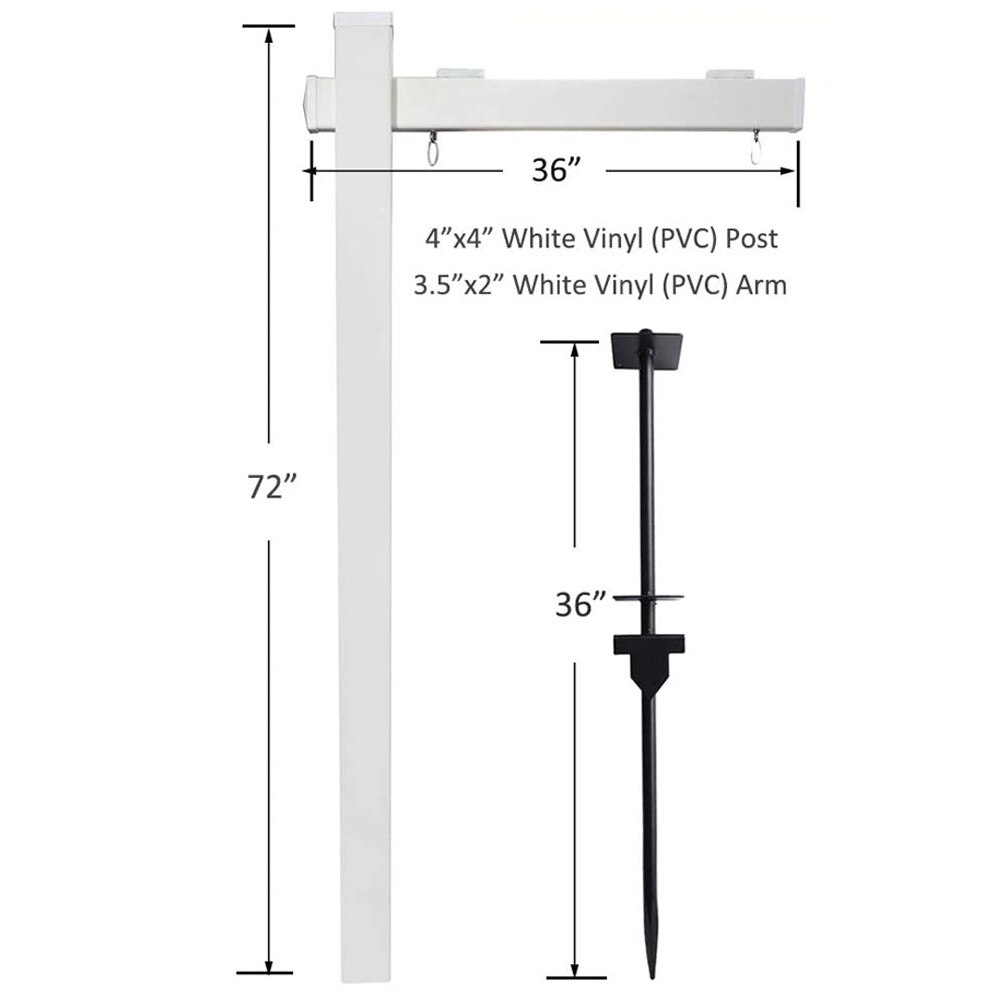 The main post dims are 4” W x 4” D x 72” H with an overall arm length of 36”. Featuring double sided graphics that are UV printed on both sides of 4mm thick coroplast. There are two main graphic sizes available 23.5” W x 18” H and 23.5” W x 24” H with an optional rider graphic (23.5” W x 6”H) to display up top. #2 grommets are added to the top edge of the main graphic for extra reinforcement for the graphic clips.